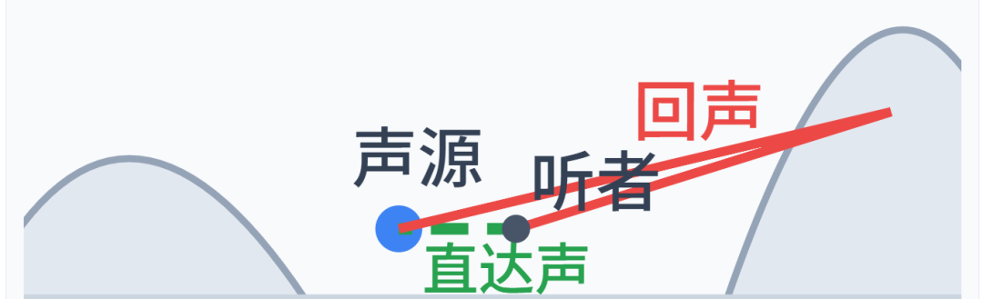 - • 回声 (Echo):想象你站在广阔的山谷中大喊一声“喂——”,几秒钟后,你会清晰地听到一个或几个延迟、分离、可辨的“喂——”从远处的山崖传来。这就是回声。它的关键特征是离散和可辨识。从技术上讲,当声源发出的直达声与第一个反射声之间的时间延迟大于50ms(大约对应17米的传播距离)时,人耳就能将其分辨为两个独立的声音事件,即回声。