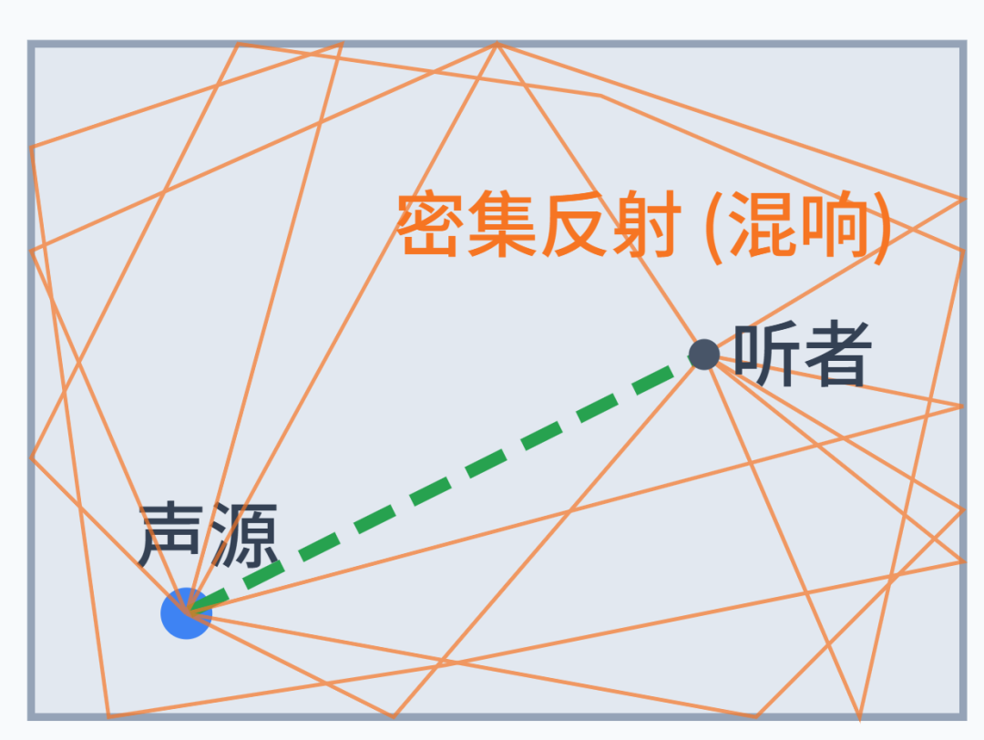 - 3. 晚期反射/混响声 (Late Reflections/Reverberation):经过无数次反射后,声波能量被充分扩散,形成一个统计上均匀的、逐渐衰减的弥散声场(Diffuse Field)。