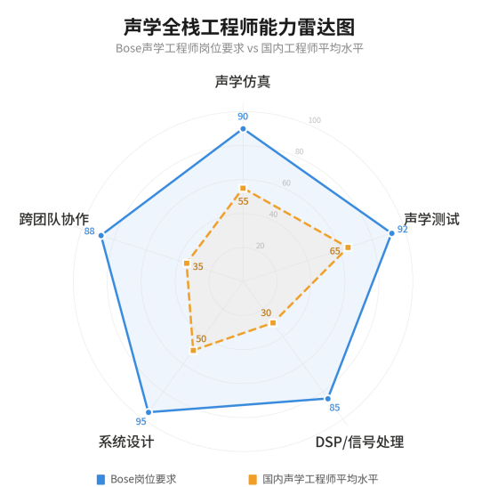 **03逐条拆解任职要求:你到底差在哪下面我把JD的任职要求拆开,逐条分析它背后真正在问什么。**5年声学设计 + 3年测量经验:门槛不是"年限",是"深度"**Bose写的是"5+ years of direct acoustic design experience of high-performance audio products"。注意关键词: direct (直接参与), high-performance (高性能产品)。这意味着:你在某个山寨蓝牙音箱厂调了5年EQ,这个不算。你得真正参与过从声学方案定义、换能器选型、箱体/腔体设计、到调音交付的完整流程,而且产品性能要站得住脚。3年测量经验同理——不是说你会用SoundCheck跑个频响就行了,而是你要能设计测量方案、定义测量工况、分析异常数据、找到问题根因。扎心真相:**国内很多"5年经验"的声学工程师,实际只是在重复第一年的工作。****MATLAB:不是"会用",是"能开发"**JD原文写的是"Knowledge of MATLAB for acoustical measurements as well as algorithm simulation / development"。注意最后那个词—— development 。不是说你会用MATLAB读个txt画个图就行了。Bose要的是你能用MATLAB做三件事: