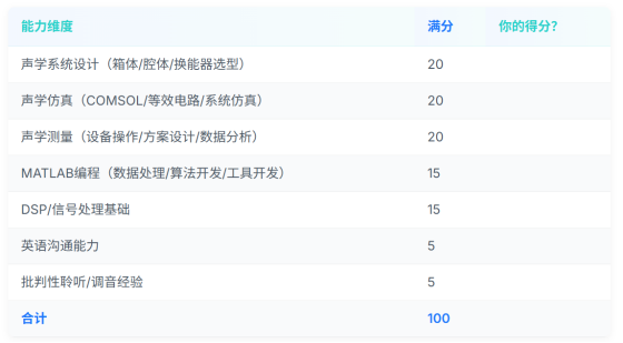 在成本、性能、空间约束之间做trade-off 这个能力,课本上学不到,靠的是长期的产品开发经验积累。但有一个"加速器"—— 如果你深入理解换能器的工作原理和仿真方法,你的选型判断力会远超只靠经验的人。 因为你能从物理机理上判断"这个方案为什么不行",而不是靠直觉。04灵魂拷问:对着这份JD,你能打几分?我帮你做了一个快速自评表,对着这份Bose JD的核心能力要求,你自己打打分: