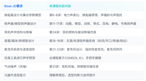 如果你总分低于60——别灰心,但确实要补课了。如果你总分在60-80——你已经是国内电声行业的中上水平,但离"Bose级别"还有系统性的差距需要填补。如果你总分80以上——你应该直接去投简历。05怎么补?精准匹配三门课程,对标Bose能力矩阵好,灵魂拷问完了。下面说正事—— 差在哪,就补哪。基于这份Bose JD的核心能力要求,我在仿真秀平台上有三门课程,恰好精准覆盖了其中最关键的几个短板。课程一:《如何成为电声高手——COMSOL声学仿真32讲》对标JD能力:声学仿真 + 换能器设计 + 系统级理解这是我的体系课,也是我花精力最多的一门。32讲,从电声原理到COMSOL仿真全覆盖,覆盖的内容我直接列关键点:和Bose JD的精准映射关系: