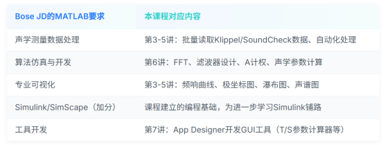 课程三:《声学工程师必备的MATLAB编程技巧》****对标JD能力:****MATLAB编程 + 数据处理 + GUI工具开发这门课直接对标Bose JD中对MATLAB能力的要求。8讲系统内容,从零基础到能开发GUI工具: